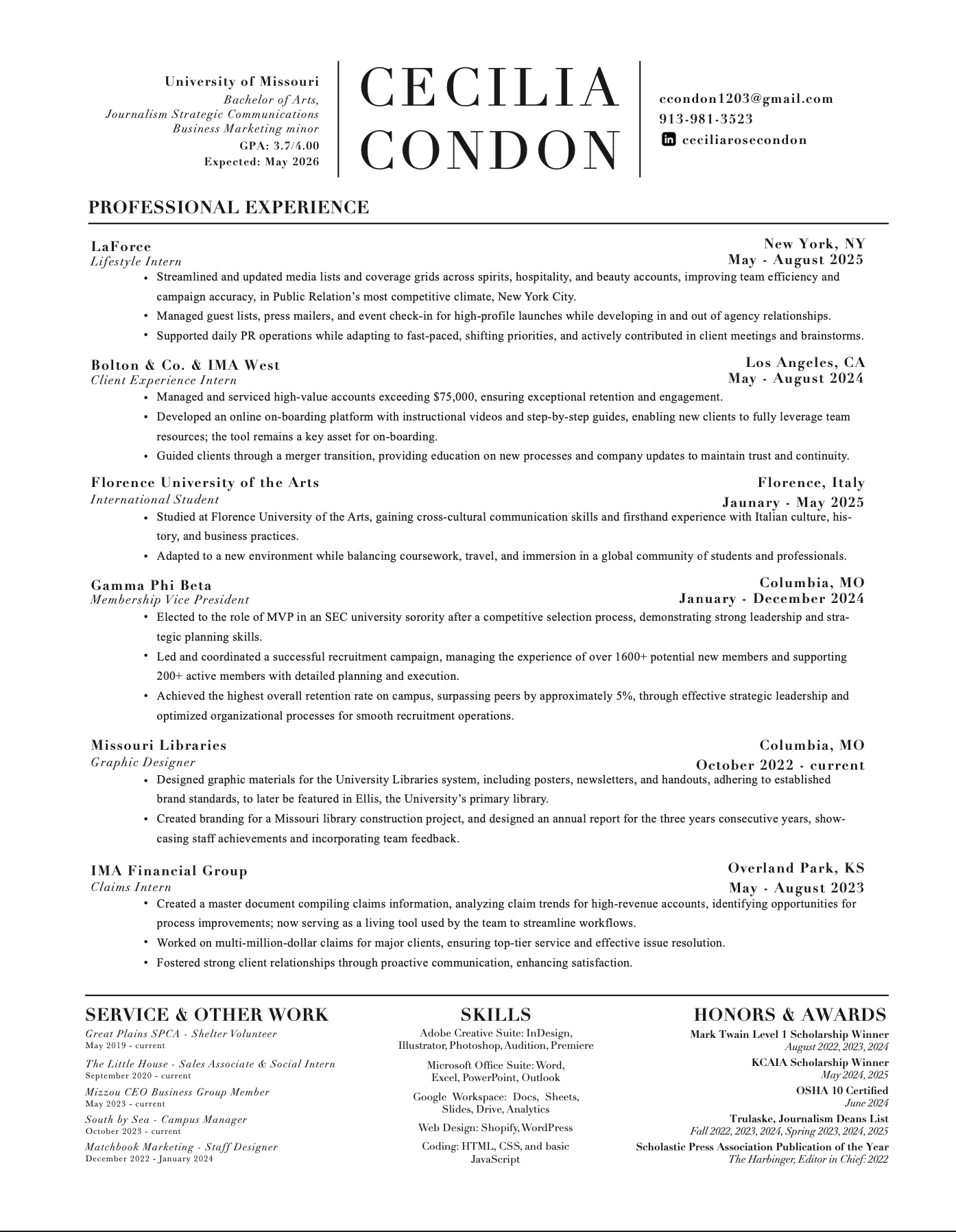 My name is Celia Condon, and I’m a student at the University of Missouri’s School of Journalism. I’m majoring in Strategic Communications and minoring in Business Marketing. Through my classes, work experiences, student involvement, and leadership roles, my interest in Marketing and Public Relations has developed into a passion. I’ve always envisioned a career where I can combine creativity and collaboration — two of my strengths. I’m eager to begin my professional journey in a city where I can grow alongside other innovative thinkers.